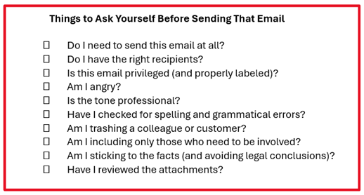 1. Do I need to send this email at all? One thing I like to tell people is that in the case of a mass extinction event, the only two things left on the earth will be cockroaches and all of those emails you thought you had deleted. That’s right, once you hit send, that email will never go away. Email, for good or bad (and mostly bad), creates a permanent, searchable record of “conversations” that can be pulled into litigation, audits, or regulatory reviews. So, before you type out an email – and especially before you hit send – ask yourself whether the message truly needs to exist or would a phone call or video conference be better? Here are some other things to consider before creating your permanent repository of crappy documents: