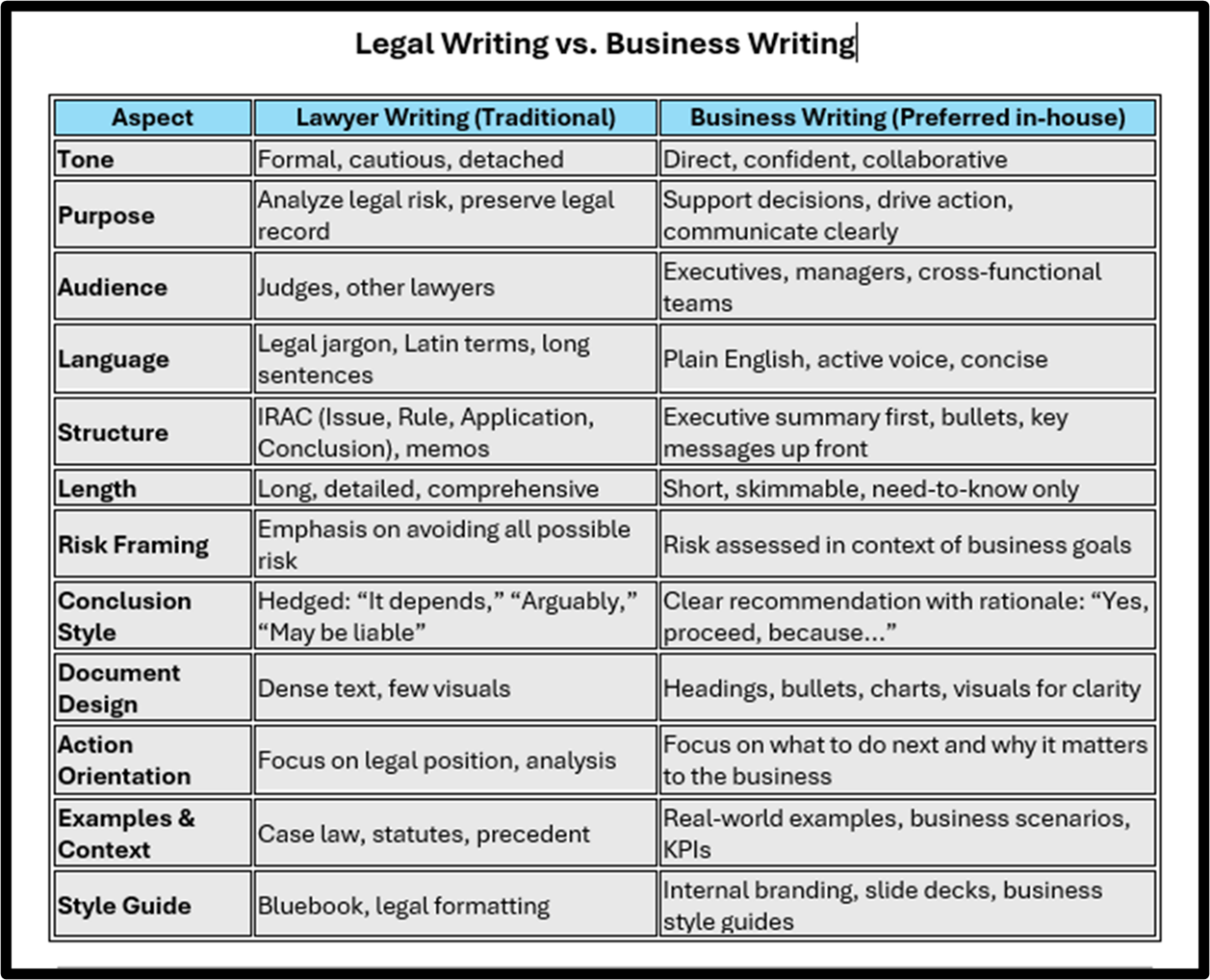 As for the first bullet, my rule of thumb is that if I cannot explain it simply, then I do not understand the problem well enough to advise on it.  Just in case you need a bit more on this, below is a chart I created to show the key differences between writing like a lawyer and writing like a business person: