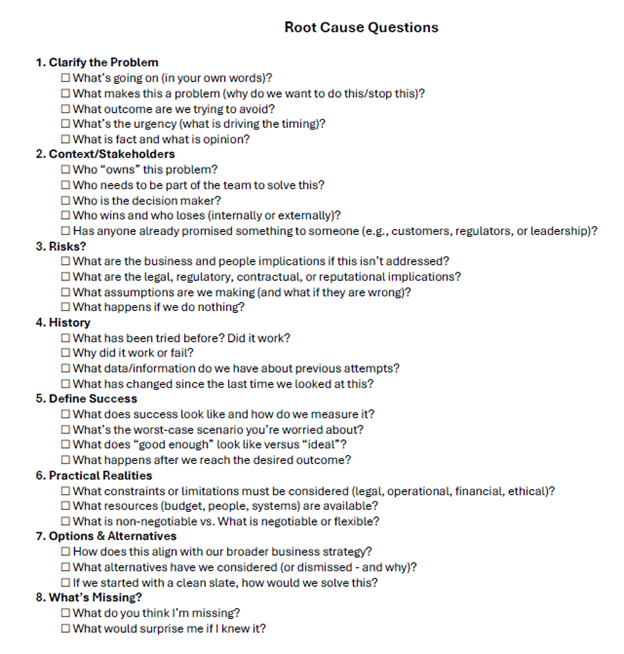 4.  Get to the core of the problem.  Executives typically don’t present problems to the legal department fully formed. They often present fragments, symptoms, and opinions.  Part of your job is to figure out what the real issue is, what the facts are (vs. opinions), and the “root cause,” i.e., what the hell is really going on?  Only when you have teased out the real issue can you help solve the problem.  It may be easy or it may be really hard.  Regardless, I have found having a set of questions designed to help you dig in is a critical tool in your hands.  Here is the list I came up with a while back as an in-house lawyer: